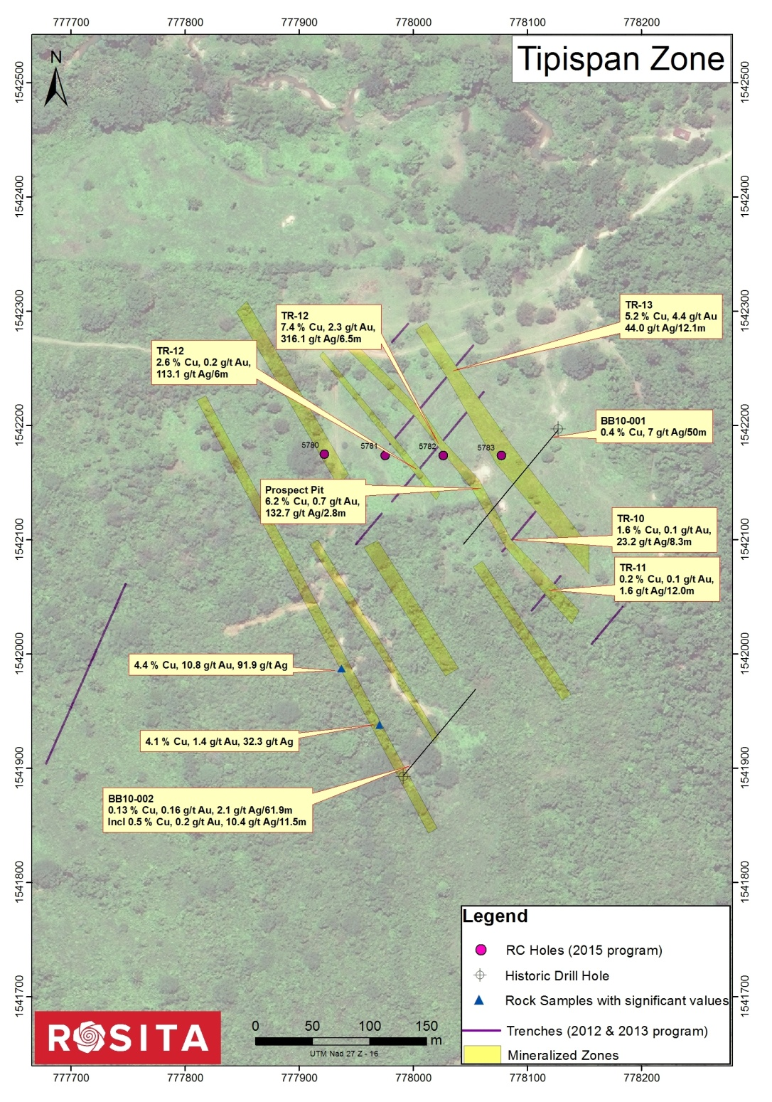 Figure 2 shows the planned holes for Tipispan, the location of trenches and holes drilled as well as the mineralized zones.