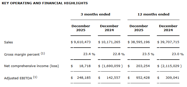 Adjusted EBITDA (earnings before interest, taxes, depreciation and amortization) for the three and 12 months ended Dec. 31, 2025, was higher than the same periods in 2024, reflecting increased net comprehensive income driven by stronger gross margins and lower operating and administrative expenses. Operating and administrative expenses decreased year over year for both reporting periods, primarily due to cost savings realized from the store closures as well as disciplined management of administrative expenditures.