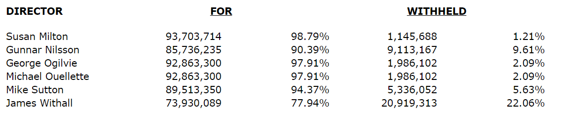 The results of the matters considered at the meeting are reported in the report of voting results, as filed under the company's issuer profile on SEDAR+ on Aug. 14, 2023.