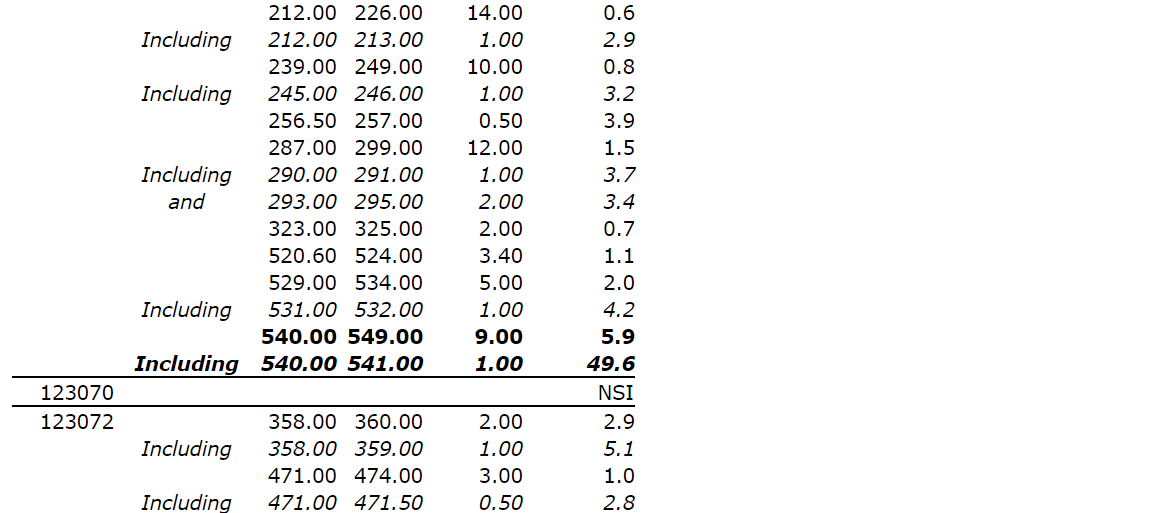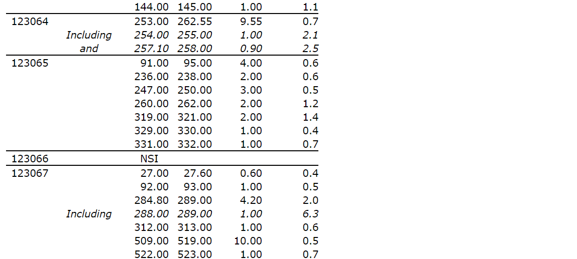 No. 123059 intersected 2.7 g/t Au over 35.1 m from 233.1 m (165 m vertical), including 56.6 g/t Au over 1.0 m.