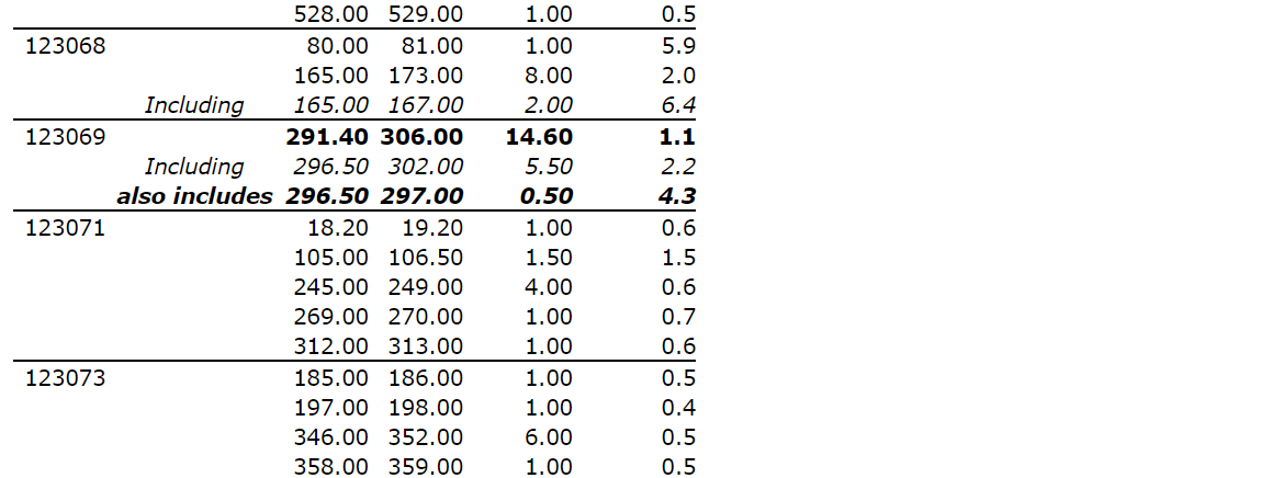 No. 123069 intersected 1.1 g/t Au over 14.6 m from 291.4 m, including 4.3 g/t Au over 0.5 m.