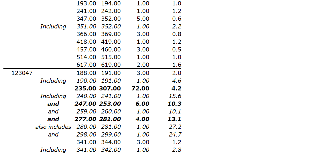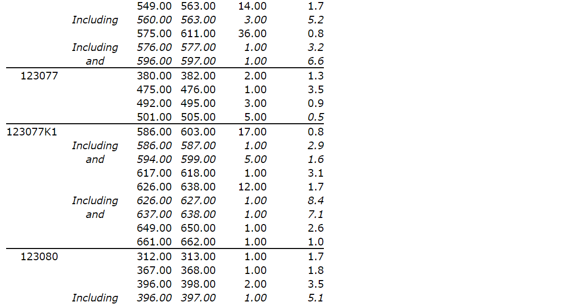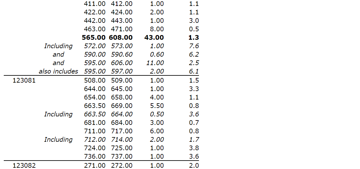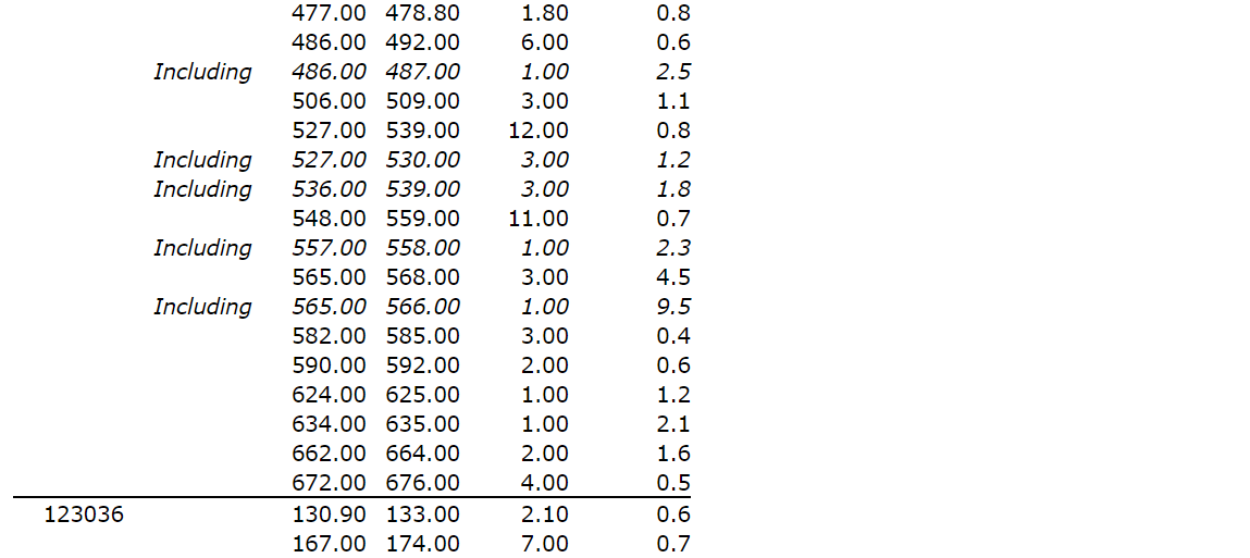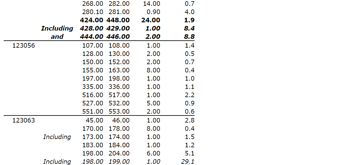 No. 123080 intersected 1.3 g/t Au over 43 m from 565 m (445 m vertical), confirming the presence of wide zones of mineralization beyond 450 m vertical depth in the eastern parts of the deposit.