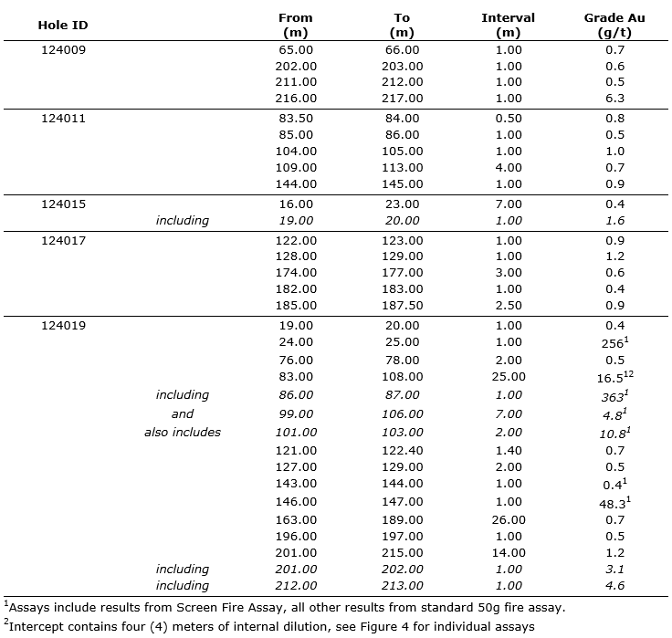 No. 124019: intersected 25 metres at 16.5 grams per tonne gold from 83 m, including one m at 363 g/t Au and two m at 10.8 g/t Au; the hole also intersected multiple other intercepts, including one m at 256 g/t Au from 25 m, one m at 48.3 g/t Au from 146 m and 14 m at 1.2 g/t Au from 201 m; drilling continues, and results from seven further drill holes in Heina