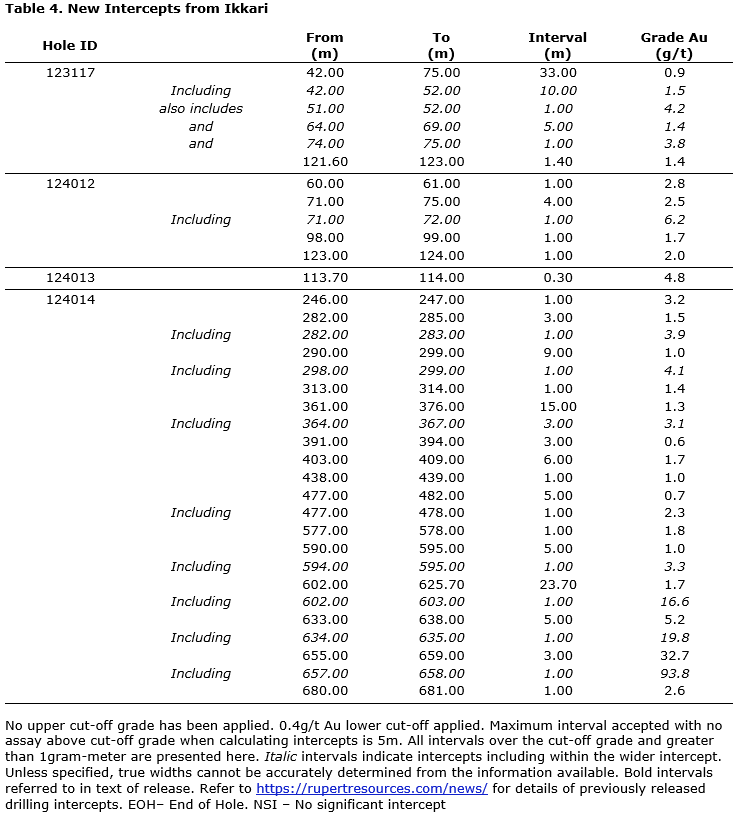 RUPERT RESOURCES REPORTS NEW RESULTS FROM WINTER DRILLING CAMPAIGN INCLUDING 16G/T OVER 25M AT HEINA SOUTH AND EXTENSION TO MINERALISATION AT IKKARI