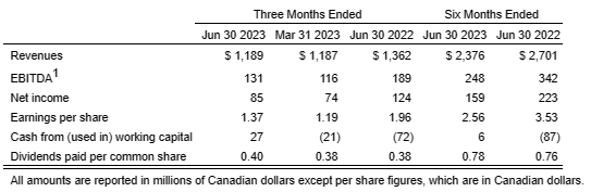 In August 2022, we initiated a normal course issuer bid to purchase for cancellation up to 3.2 million of our common shares over 12 months, representing 5% of our issued and outstanding shares. In the 2023 second quarter, we purchased and cancelled 1.2 million shares for total consideration of $44 million. Since August 2022, we purchased and cancelled 2.2 million shares at an average price per share of $32.18, for total consideration of $72 million. Subject to approval from the Toronto Stock Exchange, we intend to renew our normal course issuer bid to purchase for cancellation up to approximately 6.1 million of our common shares representing 10% of our public float over a 12-month period.