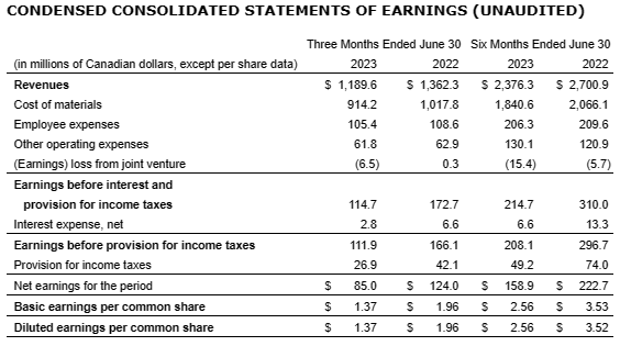 All of our business segments made strong contributions in the 2023 second quarter and resulted in an improvement in our consolidated margins, EBITDA and earnings as compared to the first quarter of 2023. Our metals service centers reported consistent revenues and higher margins in the 2023 second quarter compared to the 2023 first quarter due to higher average prices and consistent demand. Metals service centers generated average price realizations that increased 3% compared to the 2023 first quarter while tons shipped were consistent with both the first quarter of 2023 and the second quarter of 2022. Our energy field stores revenues and margins increased in the 2023 second quarter versus the 2022 second quarter due to a continuation of the favourable trend in energy sector business activity. The seasonally slower second quarter, as compared to the first quarter, was due to road closures from spring break-up in Western Canada and significant wildfire activity. Results at our steel distributors remain strong with a reduction in revenues being offset by an increase in margins, which resulted in comparable operating profits in the second quarter versus the first quarter of 2023.