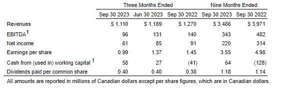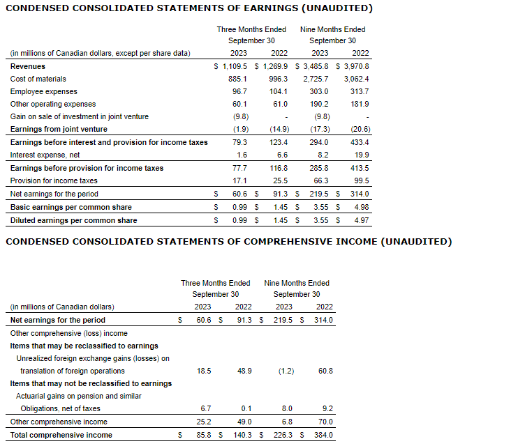 The company's basic earnings per share of 99 cents for the quarter ended Sept. 30, 2023, was lower than the $1.45 per share recorded in the third quarter of 2022 and the $1.37 recorded in the 2023 second quarter. For the nine months ended Sept. 30, 2023, the company's basic earnings per share of $3.55 compared with $4.98 for the same period in 2022. Revenues of $1.1-billion were lower than the $1.3-billion experienced in the third quarter of 2022 and the $1.2-billion in the second quarter of 2023. The company's gross margins of 20.2 per cent compared with 21.5 per cent in the same quarter of 2022 and 23.1 per cent in the 2023 second quarter.