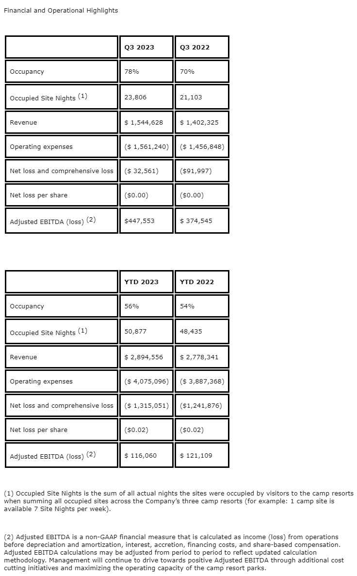 The company's Q3 revenue increased by 10 per cent, or $142,303, compared with the prior-year same period evidencing the continued demand for Pathfinder Camp Resorts as summer destinations, supported by the normalized weather conditions in the current year. Year-to-date revenue increased by 8 per cent or $116,215 year over year, driven by strong Q1 and Q3 sales, partially offset by weaker demand seen in the shoulder seasons of April to May.