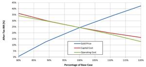 A sensitivity analysis was performed using the PFS economic model. Figure 3 and Figure 4 provide the after-tax IRR and after-tax NPV5% sensitivities to gold price, capital cost, and operating cost, respectively.