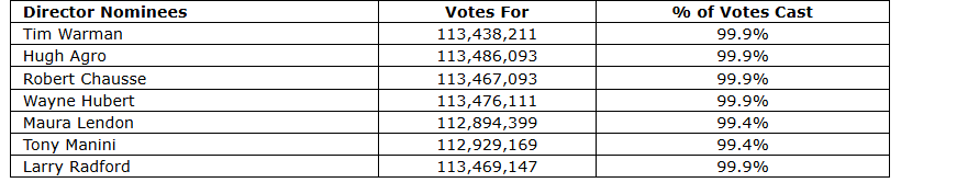 A total of 130,728,552 common shares representing 48 per cent of the company's issued and outstanding shares were voted in connection with the AGM. Shareholders approved all items of business before the AGM including the election of directors as shown in the attached table.