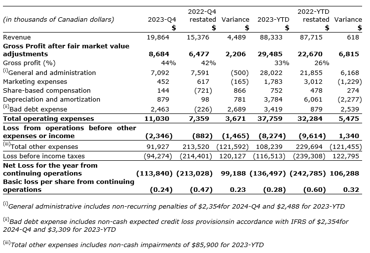- Other expenses were $91.9-million, inclusive of non-cash impairments of $85.2-million, for Q4 2023, a decrease of $121.6-million compared with Q4 2022 other expenses of $213.5-million, inclusive of non-cash impairments of $214.5-million. Other expenses also included $600,000 of finance expenses (Q4 2022 -- nil) associated with the financing of the Aleafia group of companies during its CCAA proceedings and prior to its acquisition on Jan. 12, 2024.