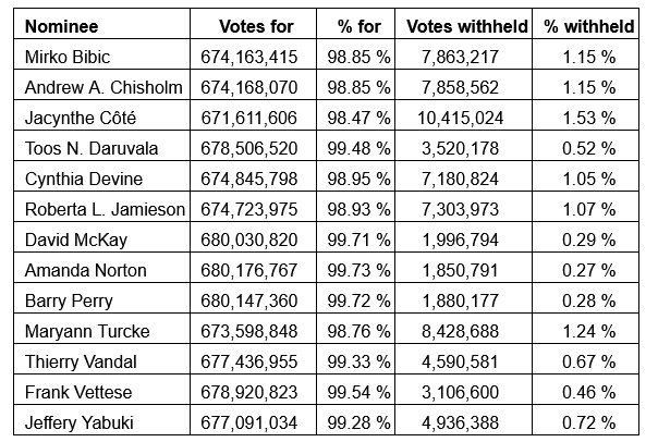 The nominees listed in the management proxy circular dated Feb. 13, 2024, were elected as directors of Royal Bank of Canada at the annual meeting of common shareholders held earlier today. The detailed results of the vote for the election of directors are set out in the attached table.