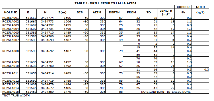 "Initial results at Lalla Aziza are encouraging, with strong indications that copper mineralization extends at depth to the northeast. We look forward to commencing detailed mapping, geophysics and targeting to define the project's full potential and optimize future drilling," said Dr. Tim Coughlin, president and chief executive officer of Royal Road. "Morocco continues to stand out as a geologically prospective and politically supportive jurisdiction -- critically positioned to contribute to the world's growing demand for secure and sustainable supplies of copper and other strategic metals."