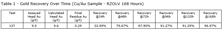 "This is an important result for Rzolv because it goes well beyond recovery alone," said Duane Nelson, president and chief executive officer of Rzolv Technologies. "To achieve this high gold recovery on a copper-bearing complex ore without pretreatment suggests that Rzolv may offer a practical alternative in mineral systems where cyanide can become penalized by copper. If supported by further work, this could translate into simpler plant design, lower capital costs, lower reagent penalty and the potential to avoid the need for a costly SART circuit that might otherwise be required under a cyanide flow sheet."