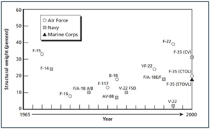 Percentage of Titanium in the Structural Weight of Selected Military Aircraft (Source: Younossi, Kennedy, and Graser, 2001, updated with recent F-22 and F-35 information)