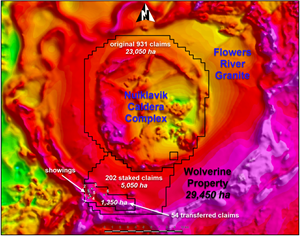 Total Magnetic Intensity (TMI) map of the Flowers River Igneous Suite (FRIS) illustrating the consolidated Wolverine Property. Polygons identify the original 931-claim Wolverine block (23,050 ha), the 54 transferred claims (1,350 ha), and the 202 claims staked by SAGA (5,050 ha). The prominent circular magnetic anomaly delineates the Nuiklavik Caldera Complex in the interior and the surrounding ring of Flowers River peralkaline granite.