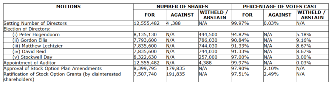 A total of 12,559,870 common shares of the company were represented at the meeting in person or by proxy, representing approximately 11.89 per cent of the total votes attached to all issued and outstanding common shares of the company as of the record date on Sept. 11, 2025.