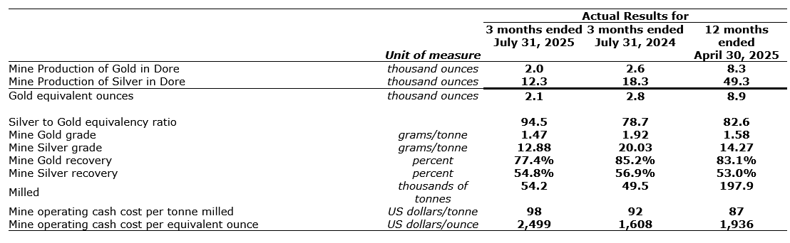 The following table is a summary of mine production statistics for the San Martin mine for the three months ended July 31, 2025 and 2024, and for the previous year ended April 30, 2025.
