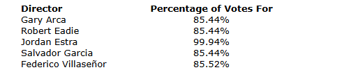 Subsequent to the meeting, the board of directors appointed Robert Eadie as president and chief executive officer, Salvador Garcia as chief operating officer, Gary Arca as chief financial officer, and Cynthia Avelino as corporate secretary.