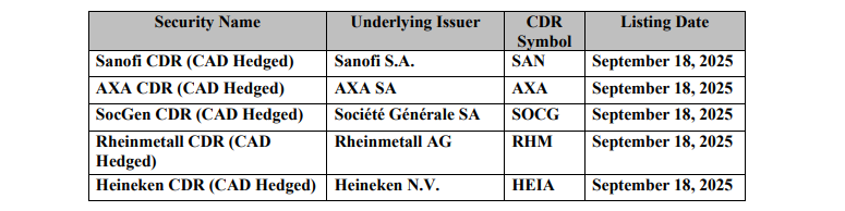 listed and available for trading on Cboe Canada at the start of trading on Thursday, Sept. 18, 2025.