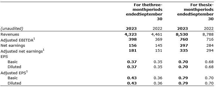 Adjusted net earnings totalled $181-million, up from $151-million, and adjusted EPS (basic and diluted) was 43 cents, up from 36 cents.