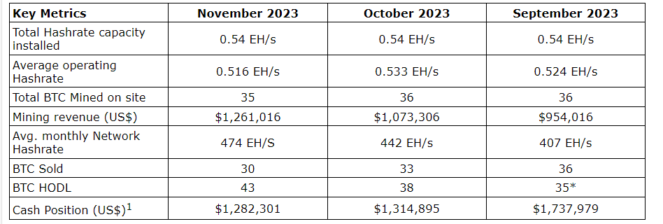 In November, Sato's operations were halted for a 28-hour period because of extraordinary work that had to be conducted by its electrical provider. As such, if Sato was to exclude that event, Sato's average operating hash rate for the month would have been 0.538 exahash/second which is even better than its month of October.