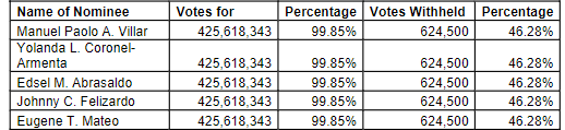 filed on SEDAR were elected as noted herein.