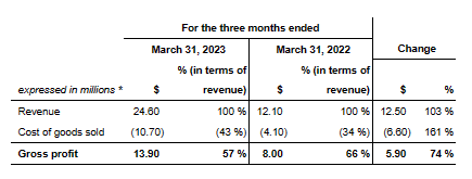 For the three months ended March 31, 2023, the Company generated revenue of $24.6 million with a gross profit of $13.9 million (57%) compared to $12.1 million with a gross profit of $8.0 million (66%) during the three months ended March 31, 2022. Revenue increased by $12.5 million (103% increase) over the prior period's revenues. The Company's revenue is generated by one segment – consumer products and within that segment by four main subsidiaries, PureKana's, Tru, BRN, No BS and other subsidiaries which do not generate material revenue currently. PureKana's first quarter revenue for the three months ended March 31, 2023, was $12.5 million compared to $9.3 million for the comparable period in 2022 (increase of $3.2 million or 34%). PureKana's revenue increase was driven by growth of new customers. Tru's first quarter revenue for the three months ended March 31, 2023, was $10.2 million compared to $2.5 million for the comparable period in 2022 (increase of $7.7 million or 308%). Tru's strong sales performance in the first quarter was driven primarily by orders from Costco in the US for a national promotion (Multi Vendor Mailers "MVM") and from major retailers in Canada. No BS's first quarter revenue for the three months ended March 31, 2023, was $0.3 million compared to $0.3 million for the comparable period in 2022. Revenue from BRN (Vibez and Seventh Sense) was $1.4 million compared to nil as BRN was acquired in the second quarter of 2022. SBBC's other subsidiaries contributed $0.2 million in the first quarter compared to 0.0 million.