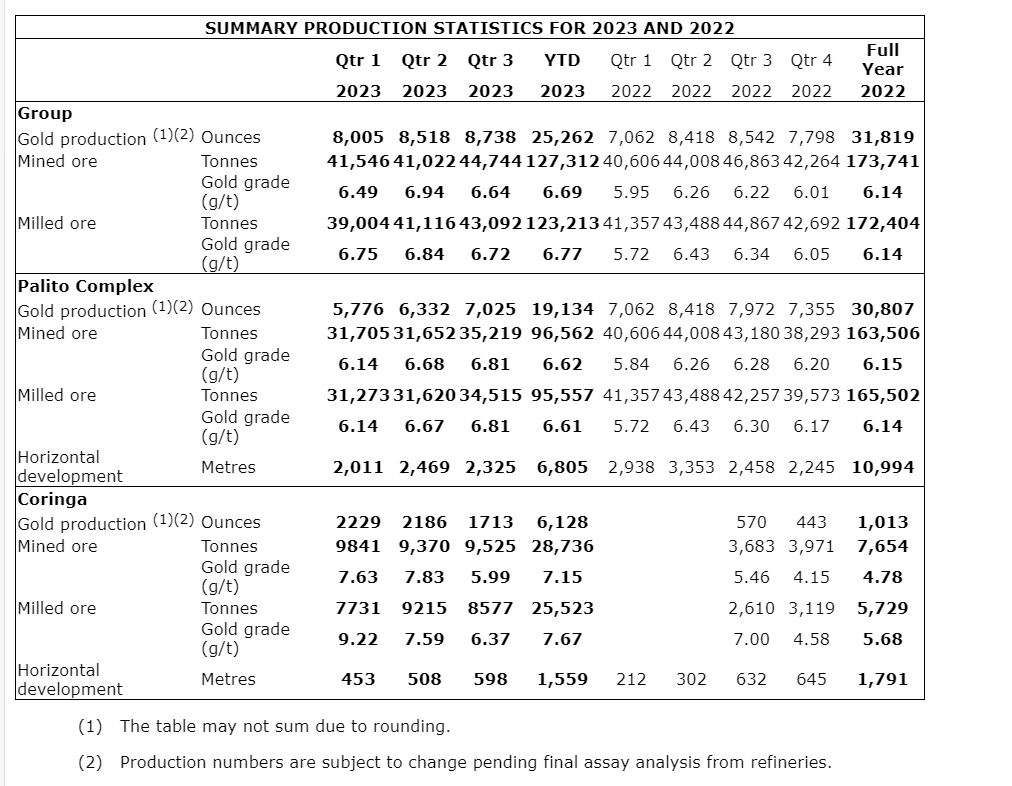 Total ore mined from the Palito complex during the quarter was 35,219 tonnes at 6.81 g/t compared with 31,652 tonnes at 6.68 g/t of gold for the second quarter of 2023. Palito grades of 6.81 g/t gold are the highest for the year to date. Most of the ore is being generated from the Ipe and Mogno veins, but development of the G3 North block has also now commenced. This looks very encouraging and is expected to be an increased source of production ounces in 2024 to 2025.