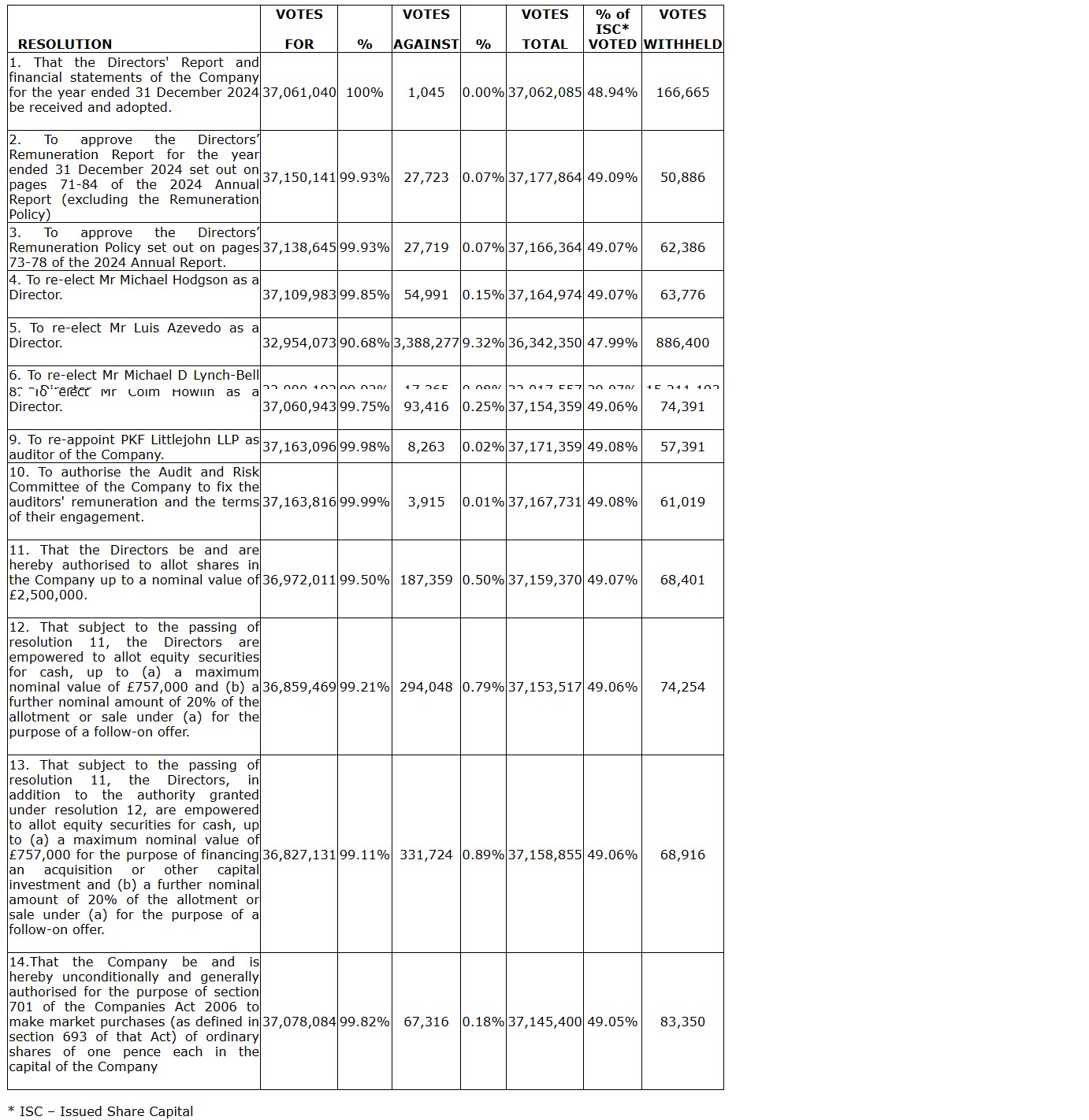 The voting was determined by a poll and the results in respect of each resolution were as shown in the attached table.