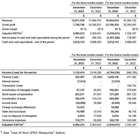 - Positive Adjusted EBITDA of US$2.1 million in Q4/2023, compared to US$2.4 million in Q4/2022. The quarter-over-quarter decrease in profit was primarily driven by a decrease in consolidated revenues, that was substantially offset through several cost and operational efficiency initiatives implemented during the second and third quarters of 2023. As of December 2023, the Company had US$7.1 million outstanding under its credit facility with Avidbank.
