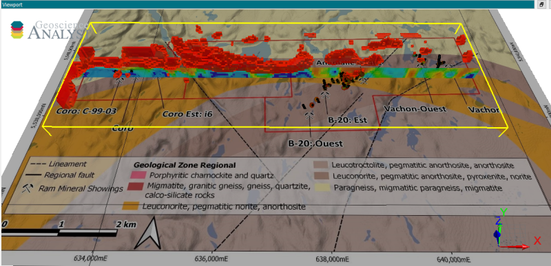 (RAM ) Project area showing historic drilling (Black) 3D Modeling 9km Strike Length