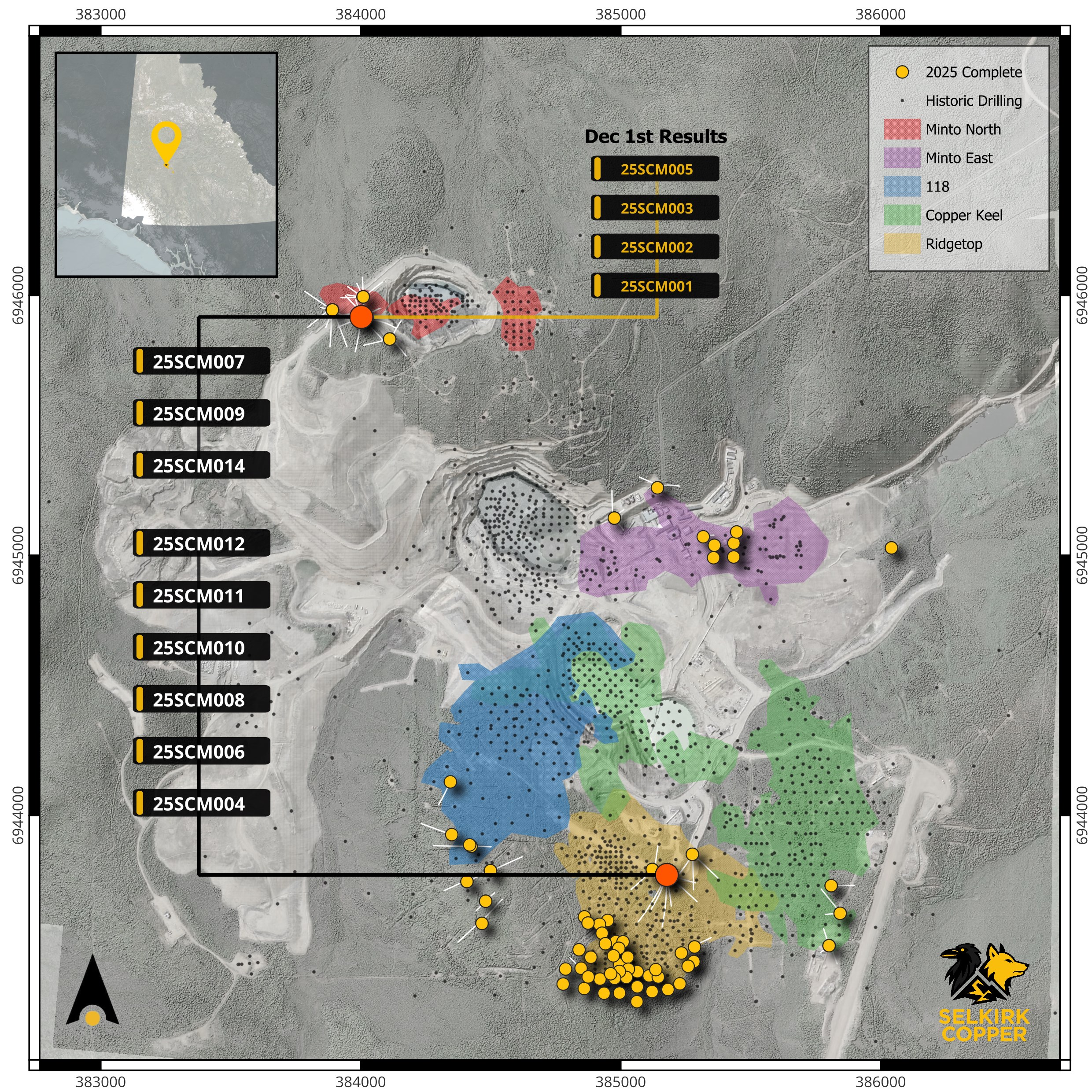 Figure 1: Plan view of the Minto Mine showing surface projections of mineralization zones (Ridgetop, Copper Keel, 118, Minto East and Minto North), relative to 2025 drill collars (yellow circles).