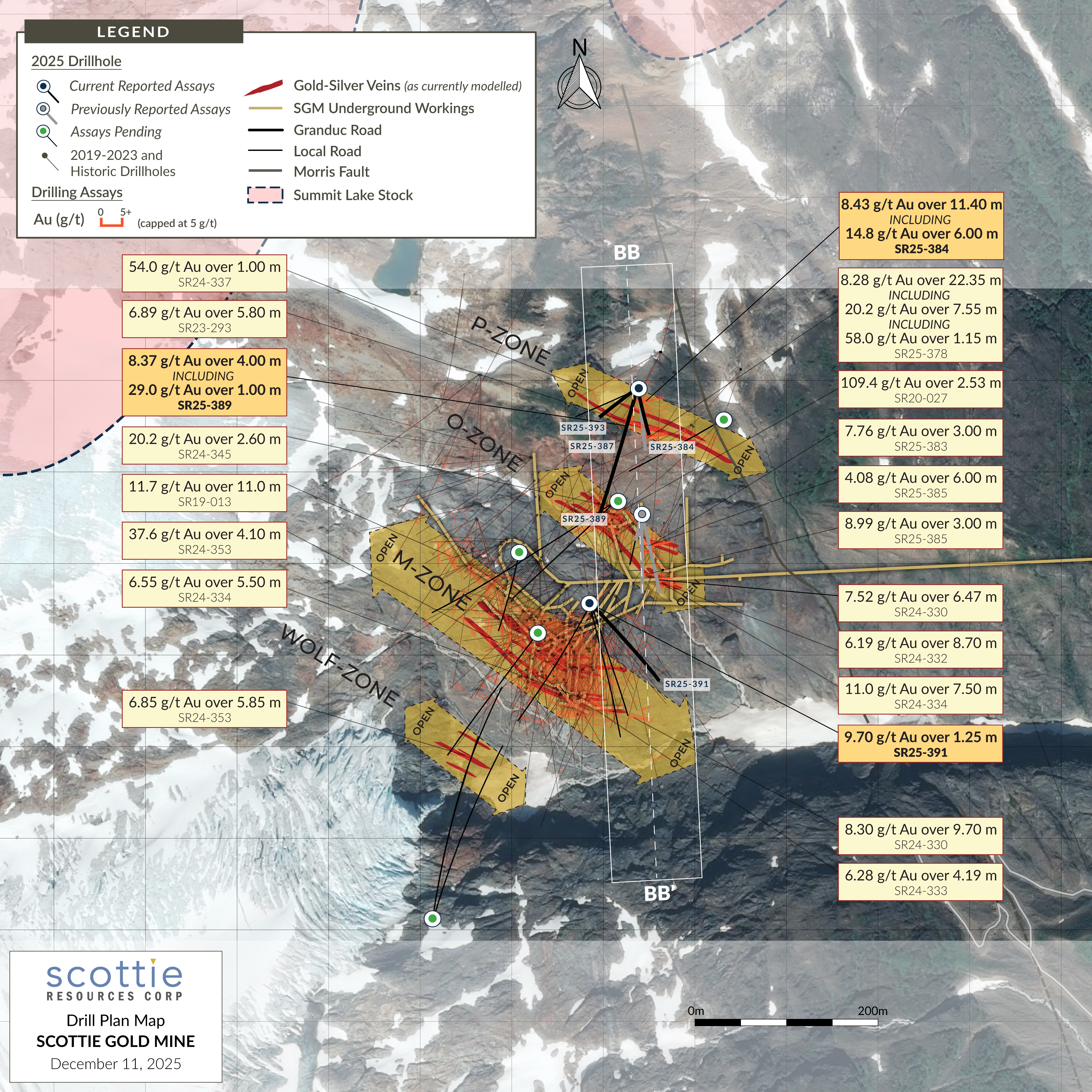 Vancouver, British Columbia--(Newsfile Corp. - December 11, 2025) - Scottie Resources Corp. (TSXV: SCOT) (OTCQB: SCTSF) (FSE: SR80) ("Scottie" or the "Company") is pleased to report new assays from its 2025 drilling of the P-Zone within the Scottie Gold Mine Project ("Scottie Gold Mine" or the "Project"). The road-accessible Scottie Gold Mine Project, which includes the 100%-owned past-producing Scottie Gold Mine and the adjacent Blueberry Contact Zone, is located 35 kilometres north of Stewart, BC, and is the subject of a newly released Preliminary Economic Assessment ("PEA") (Bird et al., October 28, 2025, Scottie Gold Mine Project, SEDAR+).