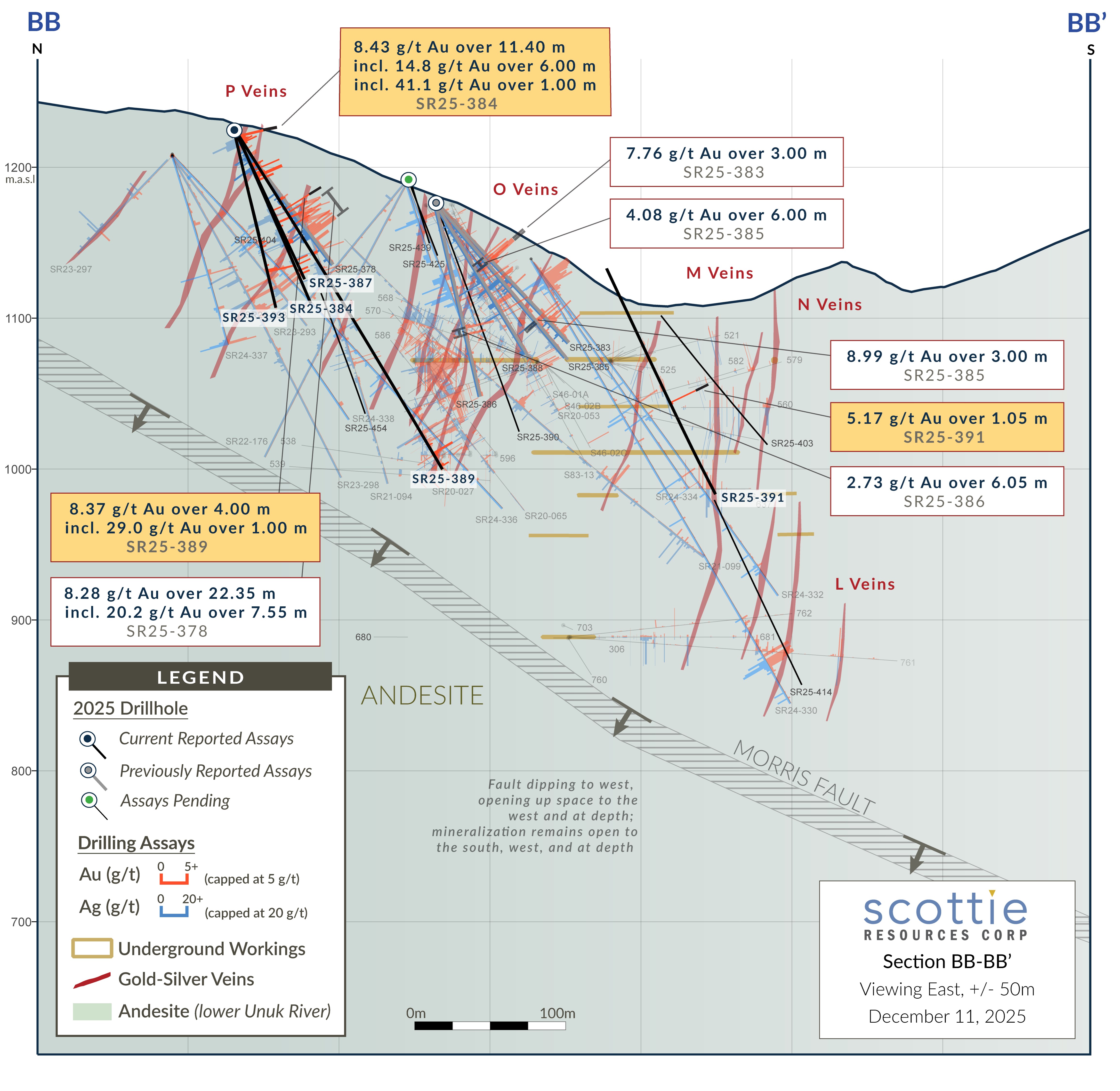 "The P-Zone at the Scottie Gold Mine project continues to demonstrate strong, consistent mineralization," stated Dr. Thomas Mumford, President of the Company. "Our ability to accurately model the multiple high-grade veins has been a key driver of this season's drilling success. Years of detailed geological logging and refinement of our structural understanding are now paying off - improving our confidence in predicting extensions and delivering high-quality drill targets that continue to expand the system."