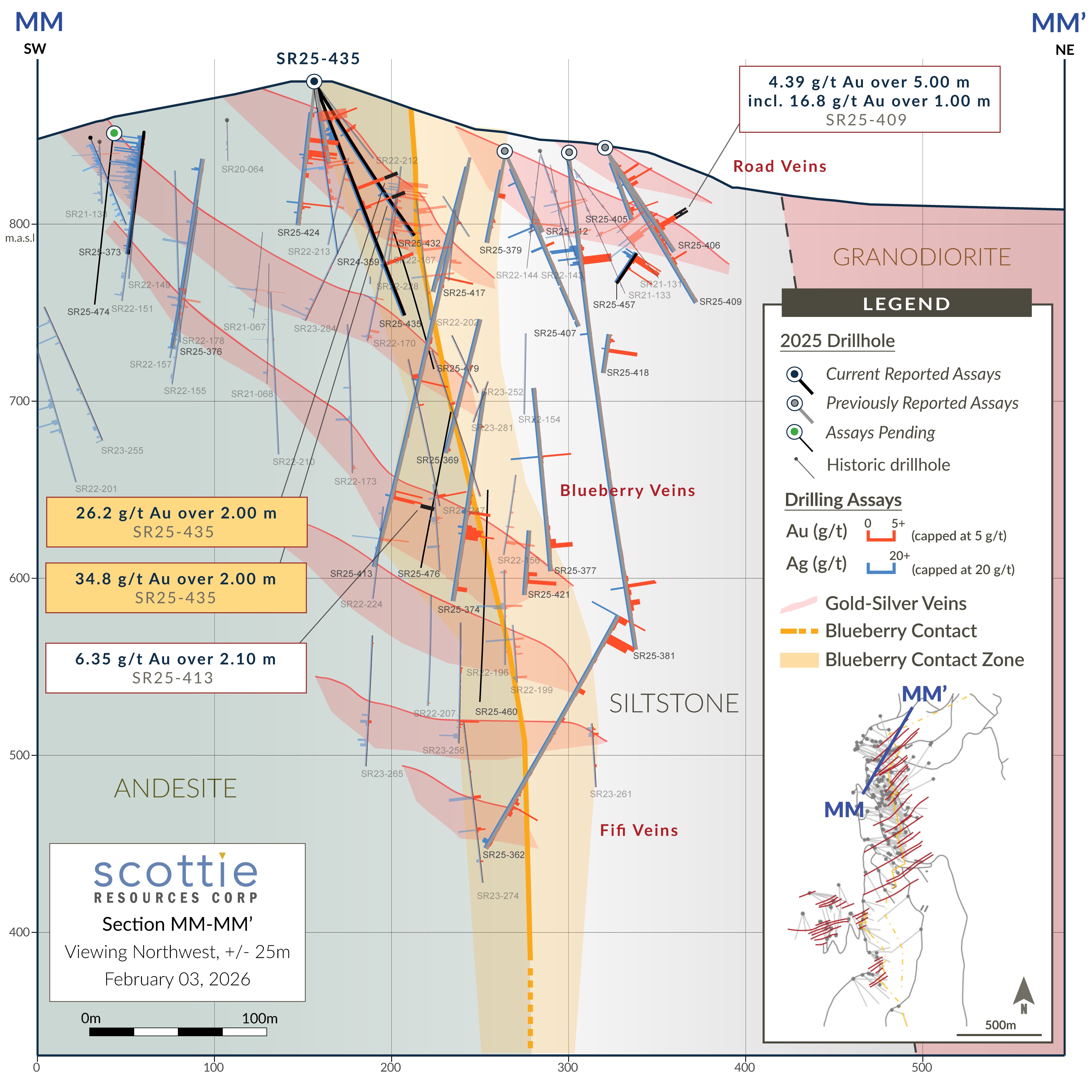 Vancouver, British Columbia--(Newsfile Corp. - February 3, 2026) - Scottie Resources Corp. (TSXV: SCOT) (OTCQB: SCTSF) (FSE: SR80) ("Scottie" or the "Company") is pleased to report new assays from its 2025 drilling of various zones within the Blueberry Contact Zone, at the Scottie Gold Mine Project ("Scottie Gold Mine" or the "Project"). The road-accessible Project is located 35 kilometres north of Stewart, BC, and is the subject of a newly released Preliminary Economic Assessment ("PEA") entitled Scottie Gold Mine Project (Bird et al., October 28, 2025, Scottie Gold Mine Project, SEDAR+).