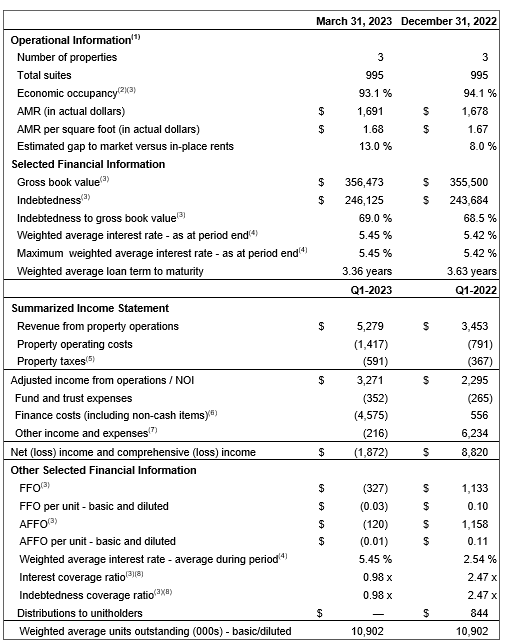 The fund reported a net loss and comprehensive loss for Q1 2023 of $1,872 (Q1 2022: net income and comprehensive income of $8,820), primarily resulting from the fair value gain on investment properties of $12,648 reported in Q1 2022, as well as increases in finance costs, partially offset by the increases in NOI including strong same-property NOI growth.