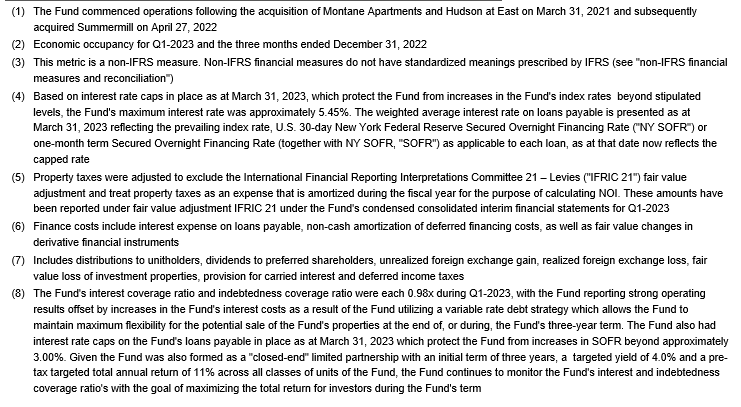 As at May 24, 2023, the fund had collected 97.8 per cent of rents for Q1 2023, with further amounts expected to be collected in future periods, demonstrating the fund's high-quality resident base and operating performance.