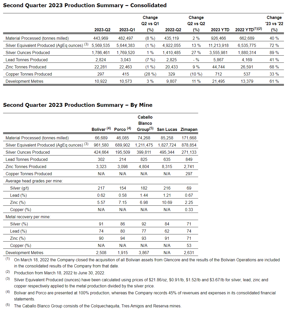 During the same period last year, 435,119 tonnes of material was processed, and 4,922,055 silver equivalent ounces was produced. While total material processed was relatively consistent when comparing Q2 2023 to Q2 2022, increased production from the higher-grade Bolivian operations offset reduced production from the lower grade Mexican operation, resulting in an increase in silver equivalent ounces.
