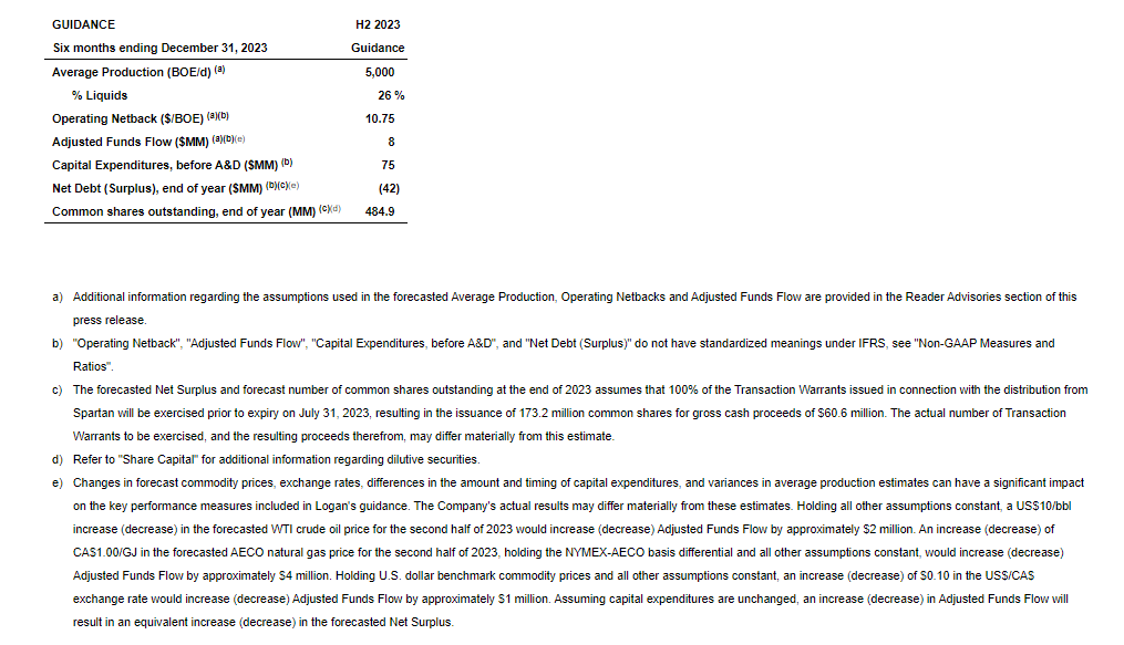 The company's capital program is expected to deliver production in excess of 7,000 BOE (barrels of oil equivalent) per day for the month of December, 2023, and to average 5,000 BOE per day for the six-month period ended Dec. 31, 2023. Logan expects to generate approximately $8-million of adjusted funds flow in the second half of 2023 based on average commodity price assumptions of $2.50 per GJ (gigajoule) for AECO natural gas, $70 (U.S.) per barrel for WTI crude oil, and an exchange rate of 1.32 (United States dollars/Canadian dollars).