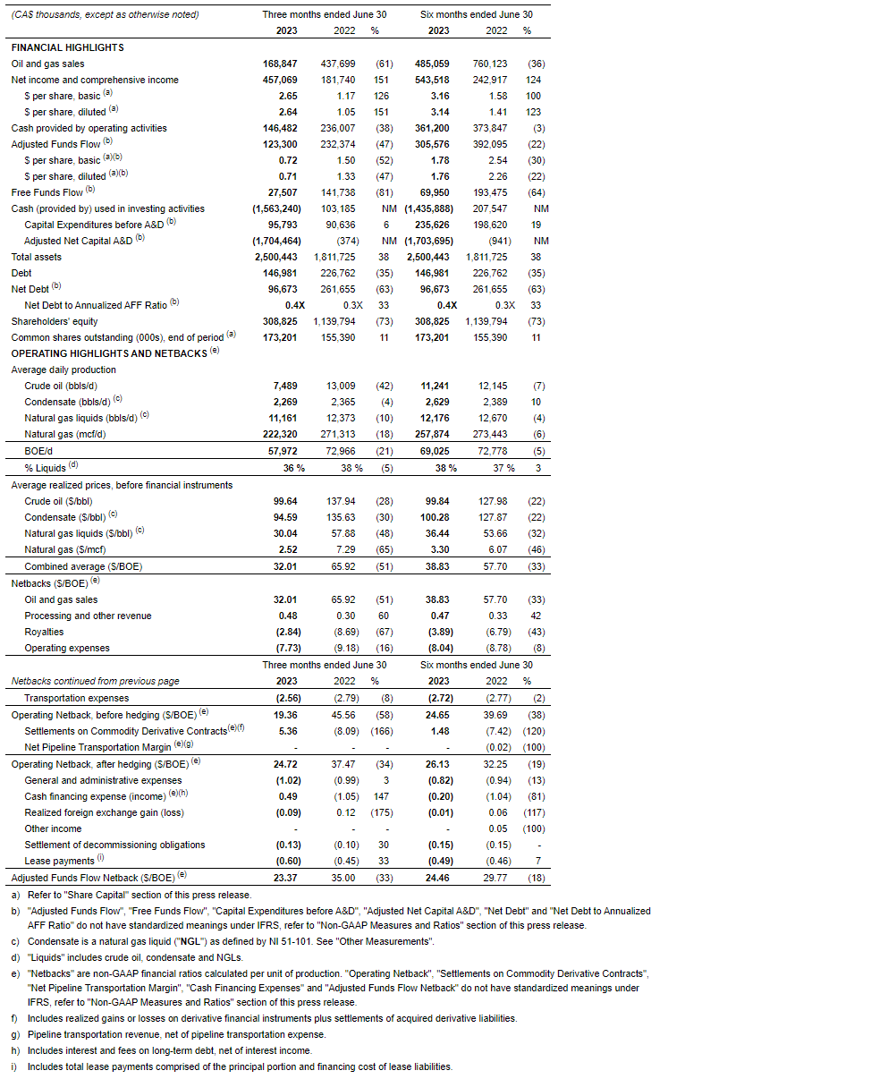 - Adjusted funds flow of $123.3-million (71 cents per share, diluted) in the second quarter of 2023; despite weaker commodity prices, which benefited from the company's strong gas hedge position.