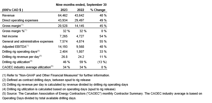 Operating days of 2,404, an increase of 597 operating days (33 per cent) from 1,807 operating days compared with the corresponding 2022 period. Operating days increased primarily as a result of the increase in rig count compared with the prior period. Drilling rig utilization for the nine-month period ended Sept. 30, 2023, was 46 per cent, which was a 13-per-cent decrease from 59 per cent compared with the corresponding 2022 period, due to the lower utilization for the nine drilling rigs acquired in 2022, and 12 per cent higher than the CAOEC industry average utilization rate of 34 per cent for the nine-month period ended Sept. 30, 2023;