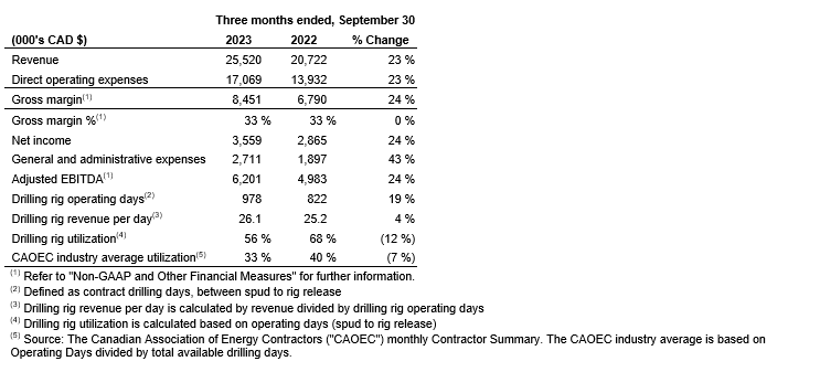 Operating days of 978, an increase of 156 operating days (19 per cent) from 822 operating days compared with the corresponding 2022 period. Operating days increased as a result of the increase in rig count compared with the prior period. Drilling rig utilization for the three-month period ended Sept. 30, 2023, was 56 per cent, which was a 12-per-cent decrease from 68 per cent compared with the corresponding 2022 period and 23 per cent higher than the CAOEC industry average utilization rate of 33 per cent for the three-month period ended Sept. 30, 2023;