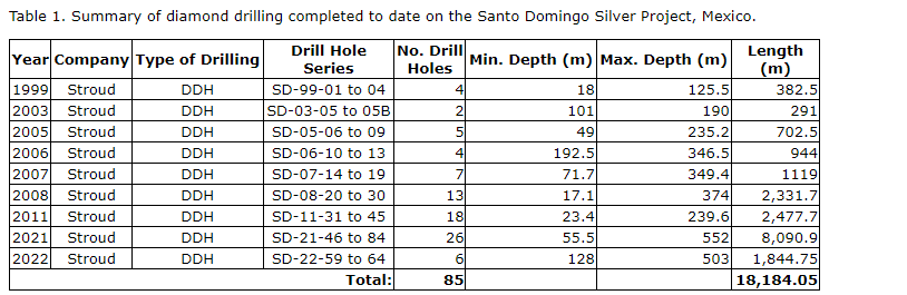 The 2021 to 2022 exploration drilling program consisted of approximately 9,936 metres in 32 diamond drill holes (first attached table) and selected results from this drilling are provided in the second attached table. The drilling program was designed to explore the extent of known epithermal vein-hosted silver mineralization on the property and to begin to define additional silver-mineralized zones and vein systems which were anticipated to run parallel to the existing La Raya and Guadalupe silver vein systems. To date, the Santo Domingo project has approximately 85 drill holes totalling 18,184 metres.