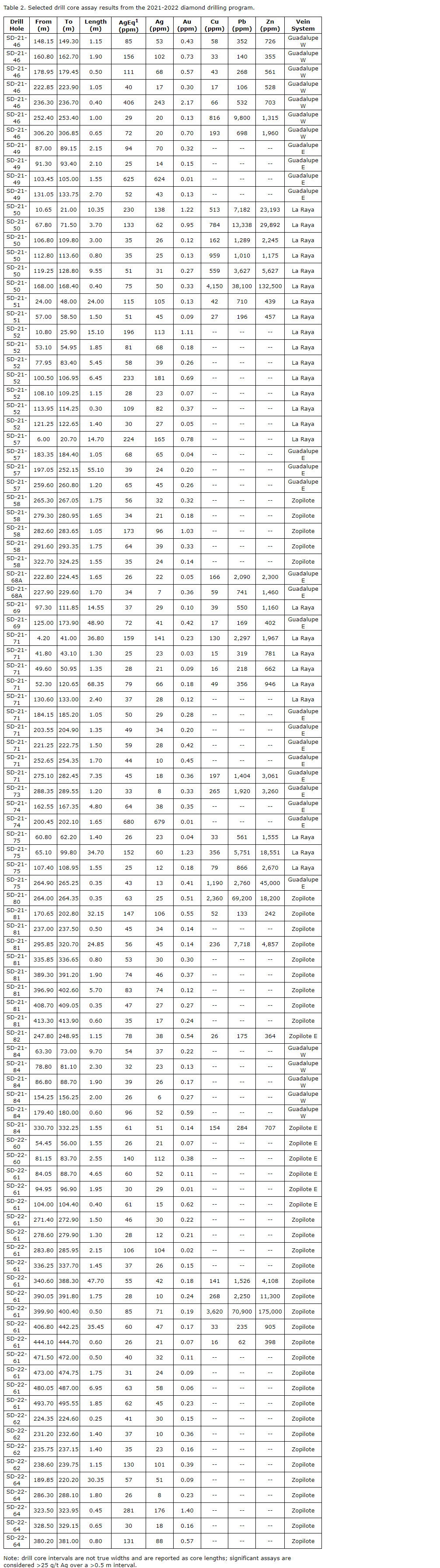 - SD-21-49: 625 grams per tonne AgEq (1) over 1.55 metres (Guadalupe East zone);