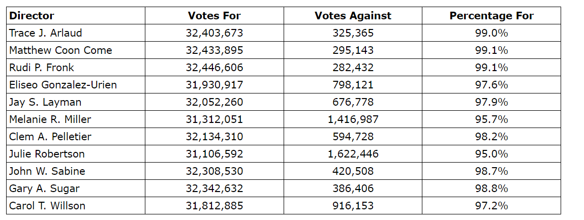 - Approval, on an advisory basis, of the corporation's approach on executive compensation (91.4 per cent votes for).