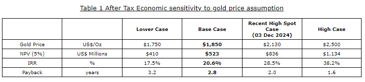 Table 9 shows the sensitivity of the 2024 PEA economic results to gold price assumptions.
