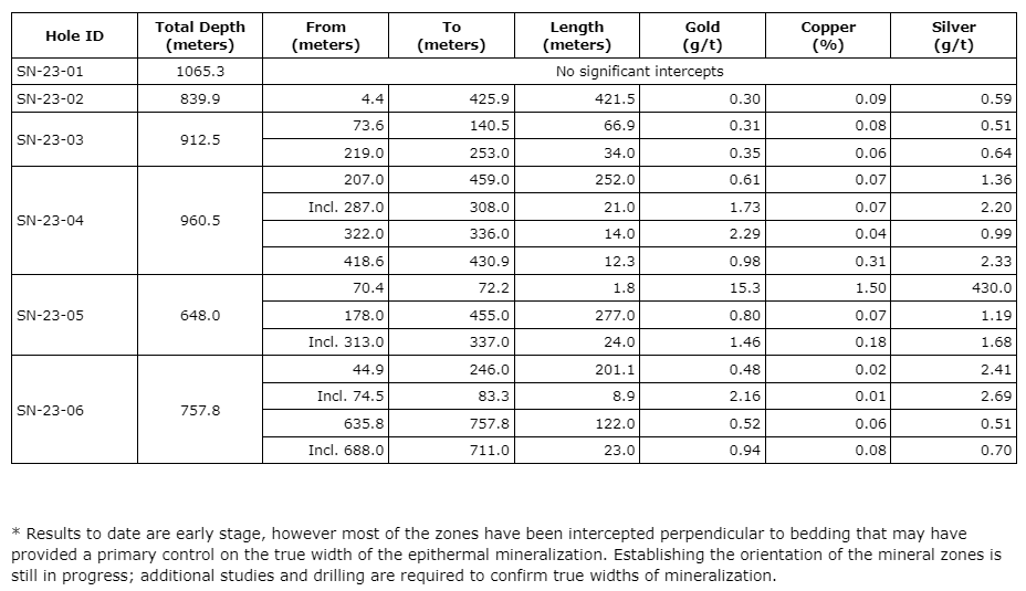 In 2023, drilling at Snip North encountered wide intersections of gold and copper that were reported in a news release dated Dec. 14, 2023, as shown in the associated table.