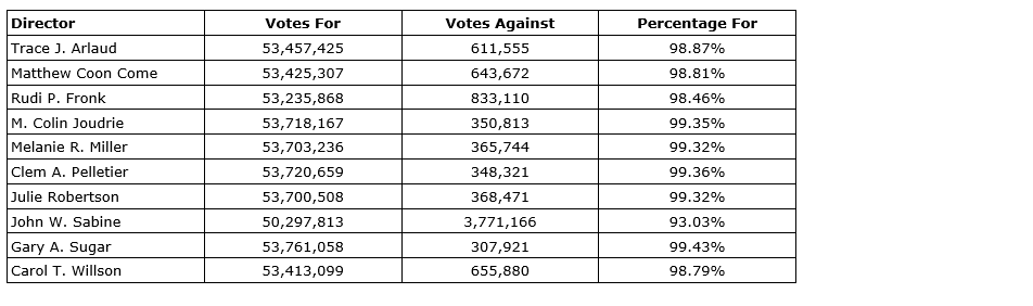 A total of 16,457,945 shares were non-votes under U.S. proxy rules, and were not cast with respect to the election of each of the directors, the approval of the adoption of the new bylaw or the advisory vote on executive compensation.