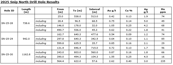 Seabridge Gold Inc. has released results of three additional drill holes completed this summer at the Snip North target on its Iskut project in British Columbia's Golden Triangle. Results confirm the continuity, tenor and size of Snip North copper-gold porphyry mineralization noted in the company's news release of Aug. 12, 2025.